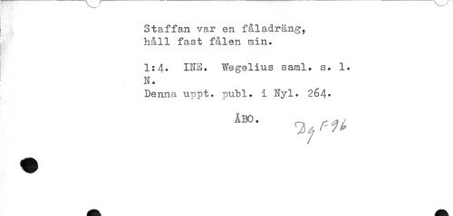 //// Staffan var en fåladräng, håll fast fålen min. //// Is 4* IHE. Wegelius saml. s* 1. H# //// Denna uppt. publ. i Nyl. 264* ////