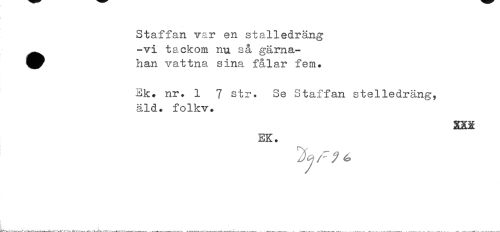 //// Staffan var en stalledräng ^^ -vi tackom nu så gärna- //// han vattna sina fålar fem» //// Sk» nr. 1 7 str. Se Staffan stelledräng, äld. folkv. //// XäS //// EK. ////