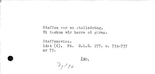 //// Staffan var en stalledräng, Vi tackom vår herre så gärna. //// Staffansvisa. //// 14:4 (é). PA. S.L.S. 277. s. 734-737 nr 73. ////