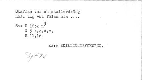 //// 1 //// \ //// Staffan var en stallerdräng Håll dig väl fålan min ... //// Ses E 1832 n5 //// G 5 a,c,d,e, //// M 11,16 //// KBss SKILLINGTHYCKSREG. ////