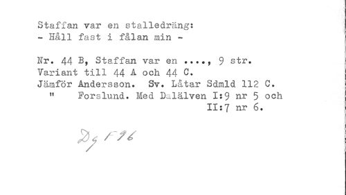 //// Staffan var en stalledräng: - Håll fast i fålan min - //// Hr. 44 B, Staffan var en ..., 9 str» Variant till 44 A och 44 C. Jämför Andersson. Sv. Låtar Sdmld 112 C. " Porslund. Med Dalälven 1:9 nr 5 och //// 11:7 nr ////