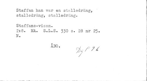 //// Staffan han var en stalledräng, stalledräng, stalledräng? //// Staffans-visan. //// 2:8. Må. S.L.S. 330 s. 28 nr 25. N. //// ÅBO. //// ^ i //// ! ////