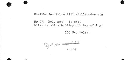 //// Stallbroder talte till stallbroder sin //// Nr 97. Mel* not. 12 str. //// Liten Kerstins bröllop och begrafning. //// 100 Sv. Folkv. //// /oif ////