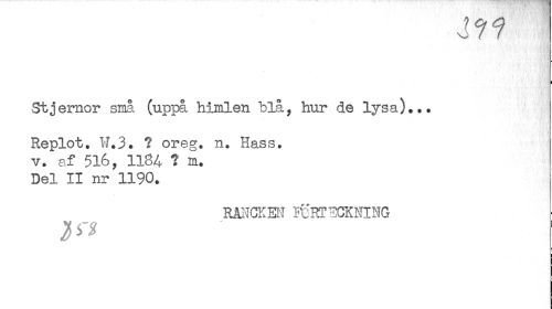 //// J?? //// I //// Stjernor små (uppå himlen blå, hur de lysa)... Replot. W.3. ? oreg. n. Hass. //// v. af 516, 1184- t m. Del II nr 1190. //// RÄNCKEN ft'RTiCKNING //// jfS ////