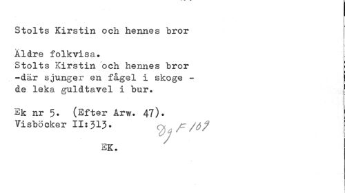 //// Stolts Kirstin och hennes bror Åldre folkvisa. //// Stolts Kirstin och hennes bror [ //// -där sjunger en fågel i skoge - I //// de leka guldtavel i bur» //// Ek nr 5. (Efter Årw. 47). Visböcker II: 313 ? c f /6^ //// EK. ////