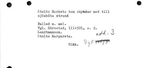 //// Stolts Märke ta hon skyMar ned till sjöabåta strand //// Ballad nu mel» //// Ygl. Särestad, 111:501, s. 2. Landtmanson. ^ J J J^ //// Stolts Margareta» //// ulma. "b^FrrrfV ////