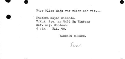 //// Stor Olles Maja var roder och vit... //// ^^ Sturska Majas missöde. //// Y.M.Å. Åcc. nr 5492 Sn Yinberg Ref. Åug. Bondeson 4 str. Sid. 50. //// YARBERG MUSEUM. //// / ////