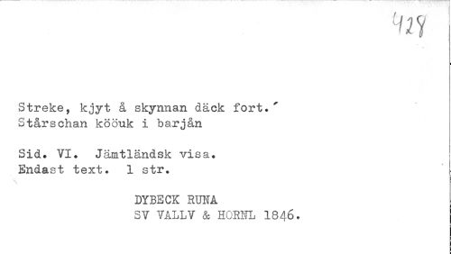 //// Streke, kjyt å skynnan däck fort.' Stårschan köönk i barjån //// Sid. VI. Jämtländsk visa. Endast text. 1 str. //// DYBECK ROTA //// SV VALLV & HORHL 1846. ////