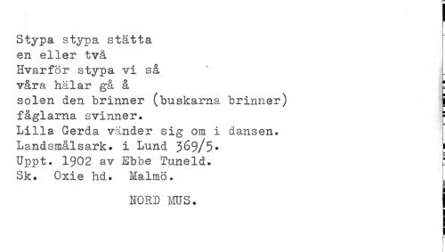 //// I //// Stypa stypa stätta en eller två Hvarför stypa vi så //// våra hälar gå å ! //// solen den brinner (buskarna brinner) jjj //// fåglarna svinner. > Lilla Gerda vänder sig om i dansen. //// Landsmålsark. i Lund 369/5* ! //// Uppt. 1902 av Ebbe Tune1d. t //// Sk. Oxie hd. Malmö. [ //// mord ms. i //// 1 ////