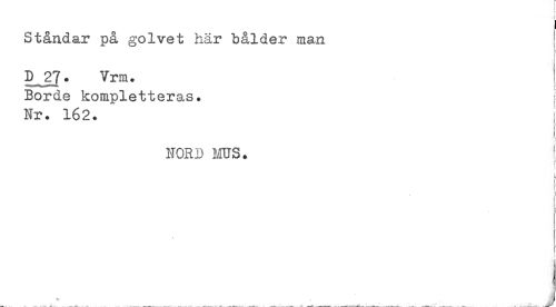//// Ståndar på golvet här bålder man \ //// ] //// D 27. Vrm. Borde kompletteras* //// Nr. 162. //// HORD MS. //// } //// 1 //// i ////