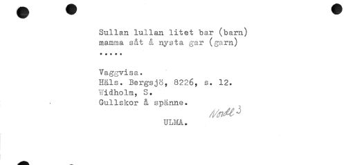 //// Sullan lullan litet bar (barn) //// mamma såt å nysta gar (garn) //// Taggvisa. //// Hals. Bergsjö, 8226, s. 12. Widholm, S. Guliskor å spänne. //// ULM. ////