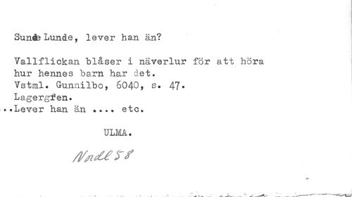 //// ¦ //// Sun&Lunde, lever han än? //// Tallflickan blåser i näverlur för att höra hur hennes barn har det. //// Vstral* GunniIbo, 6040* 47* Lagergfen. //// •»Lever I1S.XI BXl * • * % Ö "fc O * //// ULMÅ. //// .v //// - . ---*--- ////