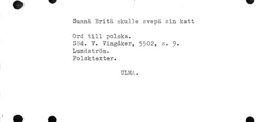 //// Sunnä Brita skulle svepa sin katt //// Ord till polska. //// Söd. 7. Vingåker, 5502, s. o. //// Lundström. //// Polsktexter. //// ULMi. ////