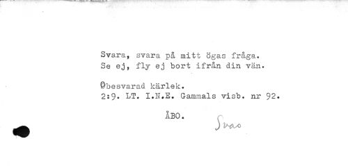 //// Svara, svara på mitt ögas fråga. Se ej, fly ej bort ifrån din vän. //// ©besvarad kärlek. //// 2:9. LT. I.H.E. Gammals visb. nr 92. //// ÅBO. ////