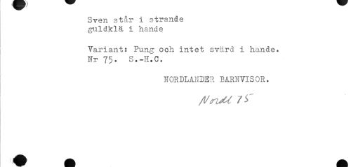//// Sven står i strande guldklä i hände //// Variant: Pung och intet svärd i hände. Nr 75. S.-II.C. //// HORDLANDER BARNVISOR. //// /VrvU ////