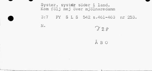 //// Syster, systör söder I land, Kom följ mej över mjölnaredamm //// 0 3:7 PY S L S 542 s.461-463 nr 253. //// N. rv //// ÅBO ////