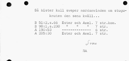 //// Så bister kall sveper nordanvinden om stugu- //// knuten den sena kväll... //// B 51:2,s.66 Ester och Axel. 7 str.kom. //// B 98:15 s. 230 " 11 » 7 str. //// A 190:53 ---6 str. //// A 205:30 Ester och Axel. 7 str. //// J trzco RA //// m //// /ft^fl--- ////