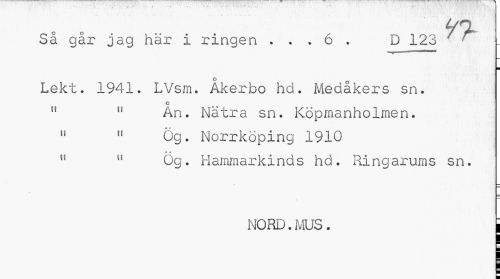 //// O O 9% //// Sä gar jag här i ringen . ? • 6 . D 123 ' r Lekt. 1941. LVsm. Åkerbo hd. Medåkers sn. //// o //// tf 11 An. Nätra sn. Köpmanholmen. //// 11 " Ög. Norrköping 1910 //// " " Og. Hammarkinds hd. Ringarums sn. //// NORD.MUS. | ////