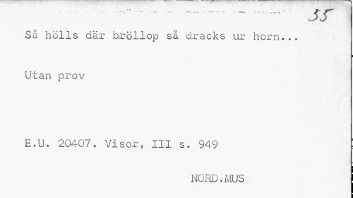 //// ¦...- -- ---- sr //// Så hölls där bröllop så dracks ur horn... Utan prov //// E.U. 20407. Visor, III s. 949 //// NORD.MUS ////