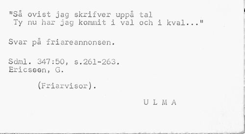 //// I //// nSå ovist jag skrifver uppå tal | //// Ty nu har jag kommit i val och i kval...11 //// i //// Svar på friareannonsen. //// Sdml. 347:50; s.261-263. Ericseen, G. //// ¦ //// (Friarvisor). //// U L M A ////