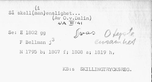 //// , • "<•.•.•••' . • . r V . •..» V. .' • ' •• i y . > -V-J/q //// (i //// Så skall(man)enslighet... //// (Av O.Dalin) VA 2U ' 41 //// Se: E 1802 gg Q j&f ,. //// 3 //// F Bellman j -.O.a' /-/Sty //// N 1795 b; 1807 f; 1303 a; 1819 h, //// = //// KB:s SKILLINGTRYCKSREG. ////