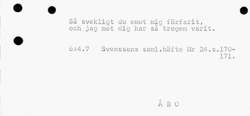 //// Så svekligt du emot mig förfarit, och jag mot dig har sä trogen varit. //// 6:4.? Svenssons saml.häfte Nr 24.s.170- //// 171. //// ÅBO ////