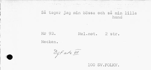 //// ^ --- ^ ^ ___ * * „ //// * -* ' * T * . .". r * , ' ''T T ' n, v r //// 'T »*• -T- //// Sä tager jag min bössa och så min lilla //// hund //// i //// Nr 93. Mel.not. 2 str. //// Necken. //// 100 SV.FOLKV. ////
