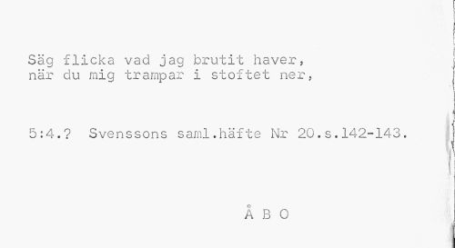 //// 1 //// i j //// i //// Säg flicka vad jag brutit haver, j //// när du mig trampar i stoftet ner. j //// v V //// 5:4.? Svenssons saml.häfte Nr 20.s.142-143. I //// < //// a b o //// 4 ^ffl ////