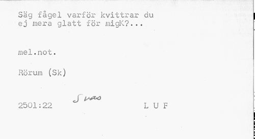 //// Säg fågel varför kvittrar du I //// ej mera glatt för migK?... //// / = //// mel.not. Rörum (Sk) //// J //// 2501:22 L U F //// I ////