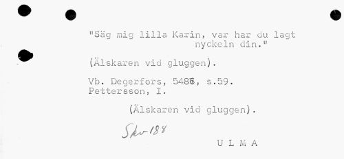 //// "Säg mig lilla Karin, var har du lagt //// nyckeln din." //// ^^ (Älskaren vid gluggen). //// Vb. Degerfors, 548©, s.59. Pettersson, I. //// (Älskaren vid gluggen). //// su >»y //// U L M A ////