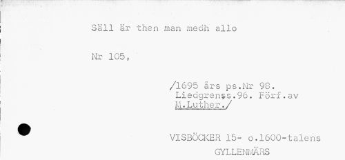 //// Säll är then man medh allo Nr 105, //// /1695 års ps.Nr 98, Lieagren$s.96. Förf.av M.Luther >/ //// ® VISBÖCKER 15- o.1600-talens //// GYLLENMÄRS ////
