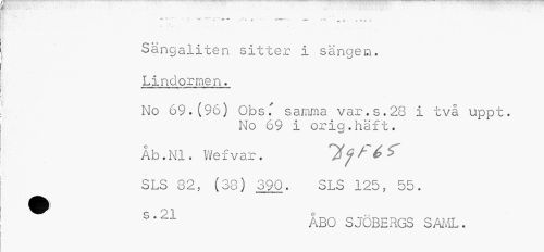 //// Sängaliten sitter i sängen. Lindormen. //// »¦"lunw:. ' «¦¦!»•« IHI.III"!!»! 'i^i n>i»wru«a« //// No 69.(96) Obs." samma var. s. 28 i två uppt. //// No 69 i orig.häft. //// Åb.Nl. Wefvar. ^ffé? //// SLS 82, (88) 390. SLS 125, 55. //// S'21 ÅBO SJÖBERGS SAML. ////