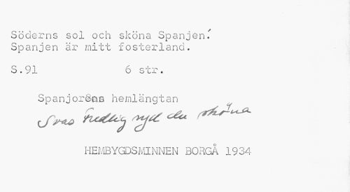 //// Söderns sol och sköna Spanjen.' Spanjen är mitt fosterland. //// S.91 6 str. //// S panjoreoe he m1ä ng ta n //// HEMBYGDS Ml IMNEN BORGA 1934 ////