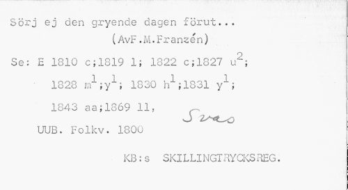 //// Sörj ej den gryende dagen förut... //// (AvF.M.Franzén) //// Se: E 1810 c;1819 1; 1822 c;1827 u2; //// ¦ 1828 n^jy1; 1830 h1 j 1831 y1; //// 1843 aa;1869 11, //// J Z^L^O //// UUB. Folkv. 1800 //// KB:s SKILLINGTRYCKSREG. ////