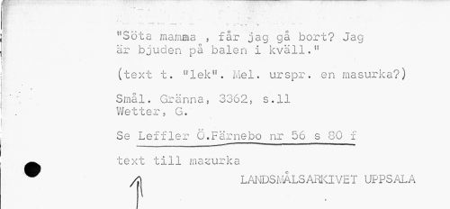 //// - r> r- ___.. X... * . ^ //// ¦ ' • i i. • v-- . • ' ' • //// V ^ » F * T //// uSöta mamma , får jag gå bort? Jag är bjuden på balen i kväll.n //// (text t. "lek". Mel. urspr. en masurka?) //// « //// '. ¦ Smål. Gränna, 3362, s.ll //// Wetter, G. //// ft * //// Se Leffler O.Färnebo nr 56 s 80 f //// ^ text till massurka //// A] LANDSMÅLS ARKIVET UPPSALA ////