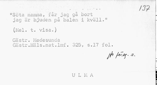//// - „ ¦ * " - - f 3 //// "Söta mamma, får jag gå bort jag är bjuden på balen i kväll.11 //// (Mel. t. visa.) //// Gästr. Hedesunda //// Gästr.Häls.nat. lmf. 325, s.17 fol. //// jfr //// U L M A I ////