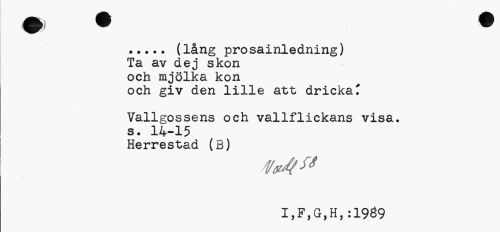 //// ... (lång prosainledning) //// Ta av dej skon och mjölka kon //// och giv den lille att drickaT Vallgossens och vallflickans visa. //// s. 14-15 //// Herrestad (B) //// I,F,G,H,:19Ö9 ////