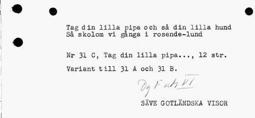 //// Tag din lilla pipa och så din lilla hund //// •Så skolora vi ganga i rosende-lund //// i " \ //// Nr 31 C, Tag din lilla pipa..., 12 str. Variant till 31 A och 31 B. //// % r //// SÄVE GOTLÄNDSKA VISOR ////