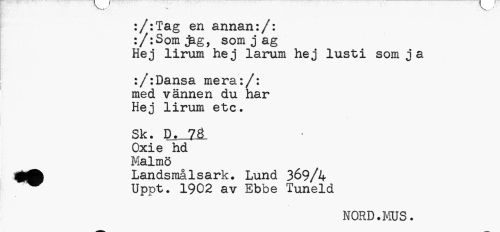 //// :/:Tag en annan:/: :/:Som jag, som j ag //// Hej lirum hej larum hej lusti som ja //// :/:Dansa mera:/: med vännen du har Hej lirum etc. //// Sk. D. 70 Oxie hd Malmö //// Landsmåls ark. Lund 369/4 Uppt. 1902 av Ebbe Tuneld //// NORD. MUS. ////