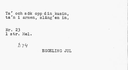 //// t B //// I //// Ta' och sök opp din kusin, ta'n i armen, släng'en in, //// i //// j //// Nr. 23 //// 1 str. Mel. //// EGGELIN G JUL //// i ////