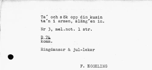 //// Ta' och sök opp din kusin ta'n i armen, släng"en in. //// Nr 3> mel.not. 1 str. //// EL IL //// komm. //// Eingdansar & jul-lekar //// F. EGGELING ////