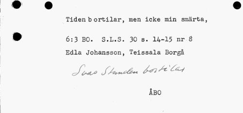 //// Tiden b ortilar, men icke min smärta, //// ® 6:3 BO. S.L.S. 30 s. 14-15 nr Ö //// Edla Johansson, Teissala Borgå //// J]^ Sa^&k A? ^ ^ //// ÅBO //// y ////