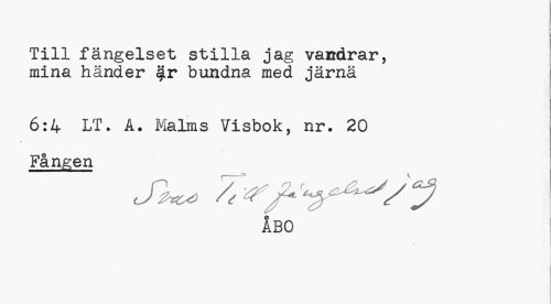 //// Till fängelset stilla jag vandrar, mina händer bundna med järnä //// 6:4 LT. A. Malms Visbok, nr. 20 Fången //// ÅBO ////