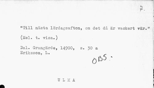 //// • I r //// "Till nästa lördagsafton, om det då är vackert vär.,f (Mel. t. visa.) //// Dal. Grangärde, 14900? s. 30 a Eriksson, L. //// 0&5- //// ULMÅ : ////