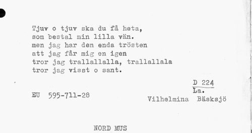//// > //// Tjut o tjuv ska du få heta, //// som hestal min lilla vän. //// men jag har den enda trösten //// att jag får mig en igen //// tror jag trallallalla, trallallala //// tror jag visst o sant. //// D 224 //// iAJ 5^5-711-28 Vilhelmina Bäsksjö //// HORD MUS ////