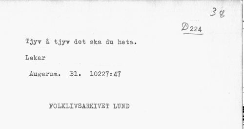 //// 3% //// 0224 //// å tjyv det ska du heta. //// Lekar //// Augerum. Bl. 10227:47 //// FOLKLIVS ABKI VE T LUND j //// i ////