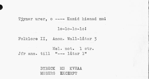 //// Tjyner urer, o --- Kumid hiemad nul //// lo-lo-lo-loi //// Folklore II, Ånon. Wall-låtar 3 //// Mel. not. 1 str. Jfr anm. till "--- låtar 1" //// DYBECK MS KVHÅÅ MOBERG EXCERPT //// / j ////