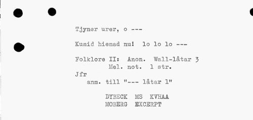 //// Tjyner urer, o --- //// ^^ Kumid hiemad mil lo lo lo--- //// Folklore II: Anon. Wall-låtar 3 //// Mel. not. 1 str. //// Jfr //// anm. till tf---låtar 1" //// DYBECK MS KVHAÅ MOBERG EXCERPT ////