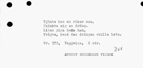 //// • Tjänte hos en riker man, //// Skänkte mig en dräng. Liten piga hade han, //// Frågte, hvad den drängen skulle heta. Nr. 372, Vaggvisa, 6 str. //// 2f* //// AUGUST BONDESOSS YI3B0K ////