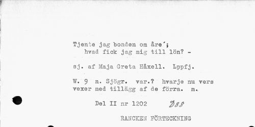 //// Tjente jag bonden om are'; //// hvad fick jag mig till lön? - //// sj. af Maja Greta Håxell. Lppfj• //// t //// W. 9 n» Sjögr. var.? hvarje nu vers vexer med tillägg af de förra, m., //// W Del II nr 1202 //// RANCKEN FÖRTECKNING ////